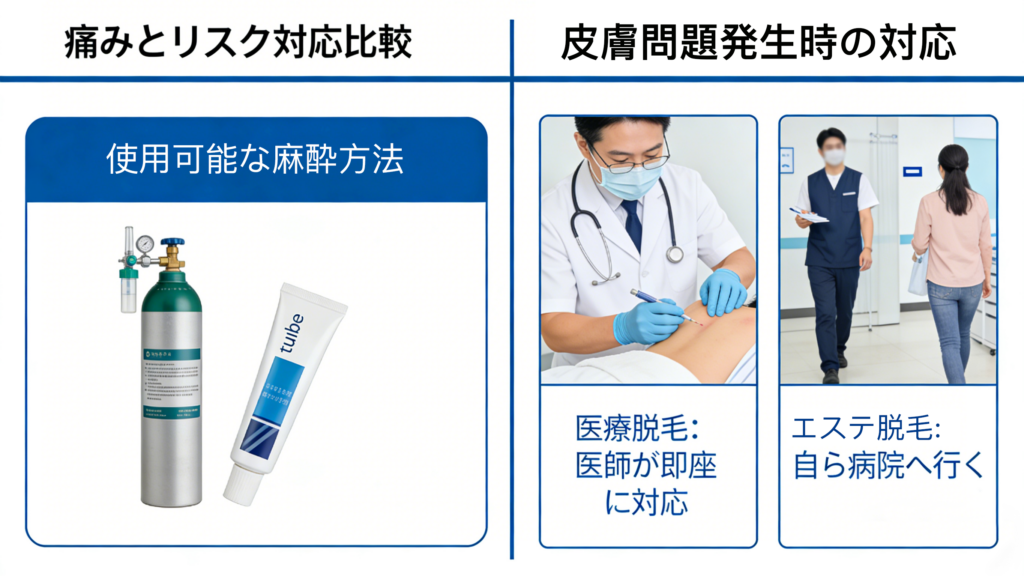 ・エステ脱毛:サロンには医師がいないため、トラブルが起きた場合は自分で外部の皮膚科を探して受診し、治療費も基本的には自己負担となります(提携クリニックがあるサロンも存在しますが、初動は遅れます)。